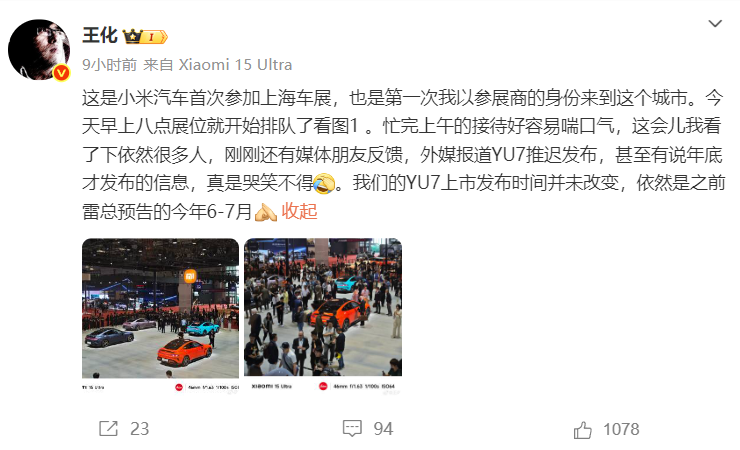 首页 > 出行 王化澄清:小米汽车YU7未推迟,年底发布系谣言 发布时间: 2025-04-23 23:09:07 阅 153 4月23日,小米公关部总经理王化表示,这是小米汽车首次参加上海车展,也是第一次我以参展商的身份来到这个城市。并辟谣小米YU7推迟上市问题:刚刚还有媒体朋友反馈,外媒报道YU7推迟发布,甚至有说年底才发布的信息,真是哭笑不得。我们的YU7上市发布时间并未改变,依然是之前雷总预告的今年6-7月。
