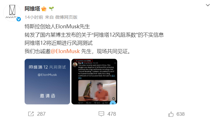 针对此事,阿维塔发文作出了回应。阿维塔方面表示:“特斯拉创始人ElonMusk先生转发了国内某博主发布的关于‘阿维塔12风阻系数’的不实信息,阿维塔12将近期进行风洞测试,我们也诚邀ElonMusk先生,现场共同见证。”