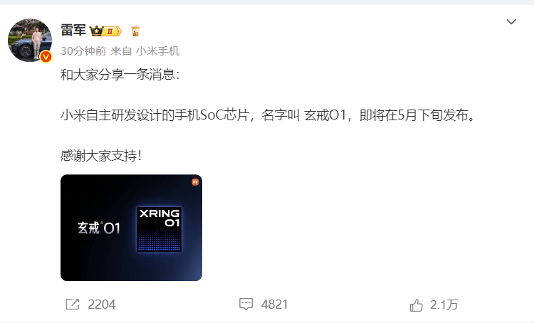 5月15日,雷军微博发文表示,小米自主研发设计的手机SoC芯片,名字叫玄戒O1,即将在5月下旬发布。