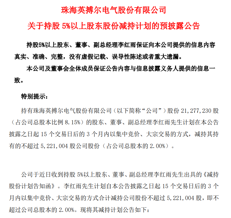 首页 > 产业 英搏尔:股东李红雨拟减持不超2%股份 发布时间: 2025-05-20 01:18:20 阅 128 5月19日,英搏尔发布公告,股东、董事、副总经理李红雨先生计划在本公告披露之日起15个交易日后的3个月内以集中竞价、大宗交易的方式,减持其持有的不超过522.1万股公司股份(占公司总股本的2.00%)。公告称,本次减持计划的实施存在不确定性风险,李红雨先生将根据市场情况、公司股价情况等情形决定是否全部实施或者部分实施本次股份减持计划。