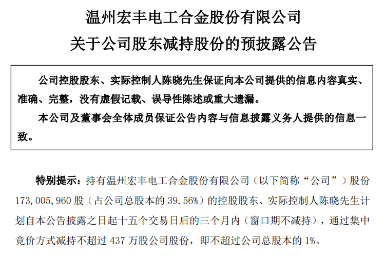 首页 > 产业 温州宏丰:实控人拟减持不超1%股份 发布时间: 2025-05-20 14:42:25 阅 92 5月20日,温州宏丰发布公告,控股股东、实际控制人陈晓先生计划自本公告披露之日起十五个交易日后的三个月内(窗口期不减持),通过集中竞价方式减持不超过437万股公司股份,即不超过公司总股本的1%。公告称,本次减持计划的实施不会导致公司股权分布不符合上市条件,不会导致公司控股股东及实际控制人发生变化。