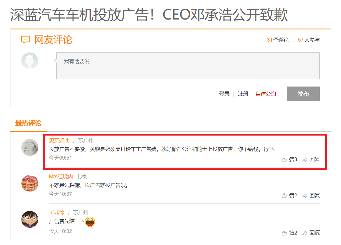 另外,也有网友表示“投放广告不要紧,关键是必须支付给车主广告费,就好像在公汽和的士上投放广告,你不给钱,行吗?”