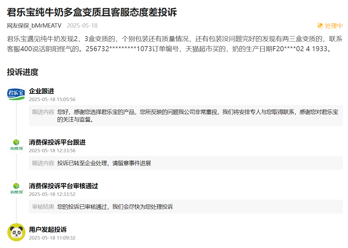 近日,有网友在消费保平台发起投诉,称购买的君乐宝纯牛奶出现变质情况,且客服态度不佳。