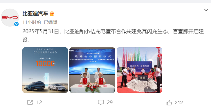 5月31日,比亚迪宣布与小桔充电合作共建10000座兆瓦闪充桩、与新电途合作共建5000座兆瓦闪充桩。