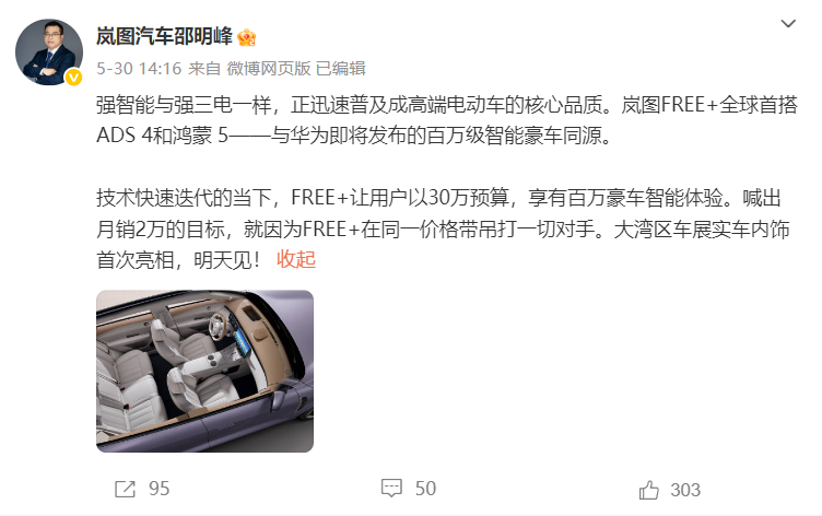 首页 > 出行 邵明峰:对于FREE+的销量目标,月销2万 发布时间: 2025-06-01 03:02:26 阅 93 5月30日,岚图汽车CBO、销售公司总经理邵明峰在社交媒体表示,“岚图FREE+全球首搭ADS 4和鸿蒙 5。技术快速迭代的当下,FREE+让用户以30万预算,享有百万豪车智能体验。”据了解,岚图FREE+将在6月开启预售。FREE+的智能座舱同样基于鸿蒙系统开发,并成为全球首款搭载鸿蒙座舱5与ADS4的“满血华为”车型。对于FREE+的销量目标,邵明峰表示,“喊出月销2万,就因为FREE+在同一价格带吊打一切对手”。