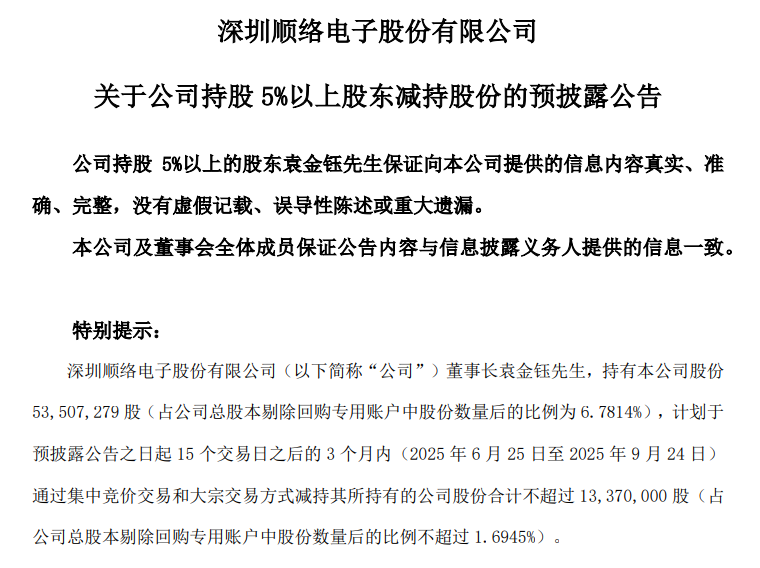 6月2日,顺络电子发布公告,公司董事长袁金钰先生计划于预披露公告之日起15个交易日之后的3个月内(2025年6月25日至2025年9月24日)通过集中竞价交易和大宗交易方式减持其所持有的公司股份合计不超过1337万股(占公司总股本剔除回购专用账户中股份数量后的比例不超过1.6945%)。