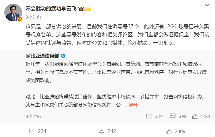 此外,比亚迪集团、品牌及公关处总经理李云飞也转发了比亚迪法务部该公告并表示,这只是一部分诉讼的进展,目前在诉黑号37个,此外还有126个账号已进入黑号观察名单。这些黑号发布的内容和相关评论区,全都会做证据保全。