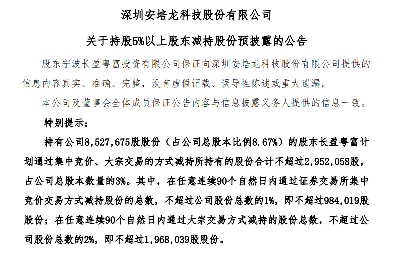 6月5日,安培龙发布公告,公司股东长盈粤富计划通过集中竞价、大宗交易的方式减持所持有的股份合计不超过295.21万股,占公司总股本数量的3%。