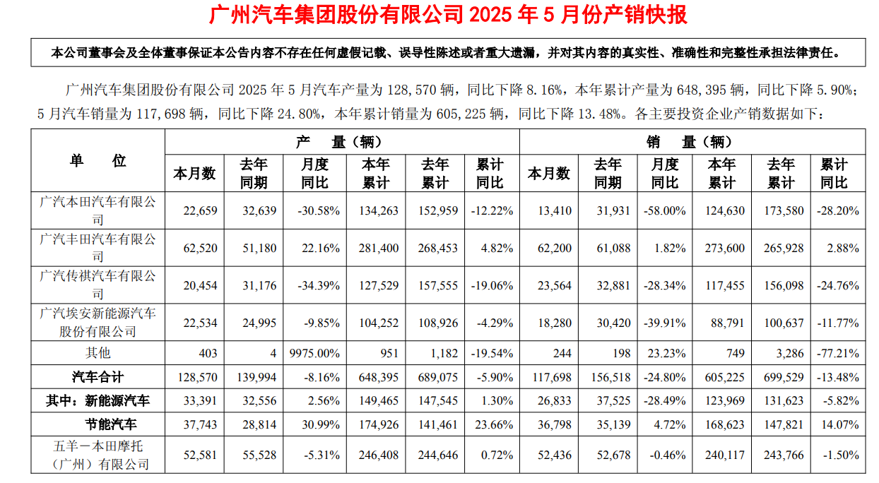 首页 > 出行 广汽集团:5月汽车销量为11.77万辆,同比下降24.80% 发布时间: 2025-06-06 17:14:04 阅 95 6月6日,广汽集团发布公告,2025年5月汽车产量为12.86万辆,同比下降8.16%,本年累计产量为64.84万辆,同比下降5.90%;5月汽车销量为11.77万辆,同比下降24.80%,本年累计销量为60.52万辆,同比下降13.48%。