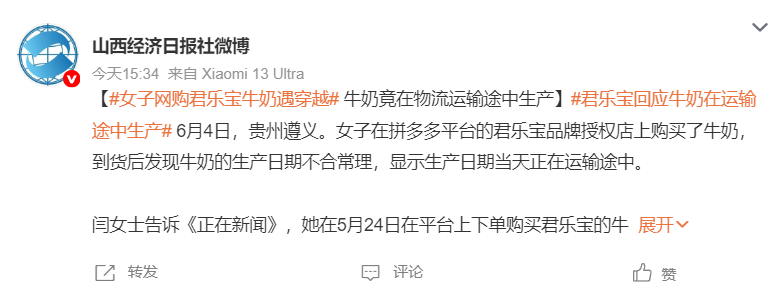 6月4日,贵州遵义闫女士称,5月24日在拼多多君乐宝授权店购买牛奶,5月26日物流显示转运,27日运输中,31日收货。却发现瓶盖生产日期为5月27日、上市日期5月28日,且瓶身磨损严重。