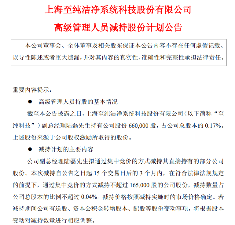 6月13日,至纯科技发布公告,公司副总经理陆磊先生拟通过集中竞价的方式减持其直接持有的部分公司股份。本次减持自公告之日起15个交易日后的3个月内,在符合法律法规规定的前提下,通过集中竞价的方式减持不超过16.5万股的公司股份,减持数量占公司总股本的比例不超过0.04%。