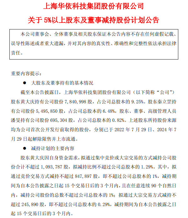 6月20日,华依科技发布公告,公司股东黄大庆拟减持公司股份合计不超过1,093,787股,不超过公司总股本的1.29%。股东秦立罡拟减持公司股份合计不超过1,271,846股,不超过公司总股本的1.5%。股东、董事、高级管理人员潘旻拟减持公司股份合计不超过173,826股,不超过公司总股本的0.21%。