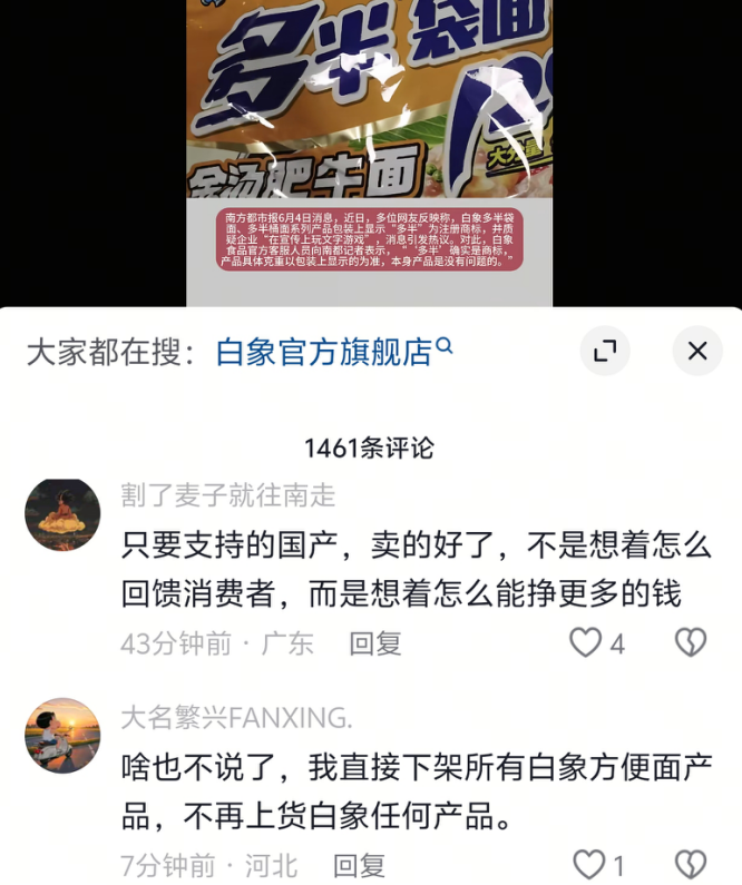 首页 > 产业 “多半”竟是注册商标?白象被质疑玩擦边宣传 发布时间: 2025-06-04 19:58:05 阅 97 近日,多位网友反映称,白象多半袋面、多半桶面系列产品包装上显示“多半”为注册商标,并质疑企业“在宣传上玩文字游戏”,消息引发热议。对此,白象食品官方客服人员向媒体表示,“‘多半’确实是商标,产品具体克重以包装上显示的为准,本身产品是没有问题的。”对此,有网友表示,“只要支持的国产,卖的好了,不是想着怎么回馈消费者,而是想着怎么能挣更多的钱。”“啥也不说了,我直接下架所有白象方便面产品,不再上货白象任何产品。”