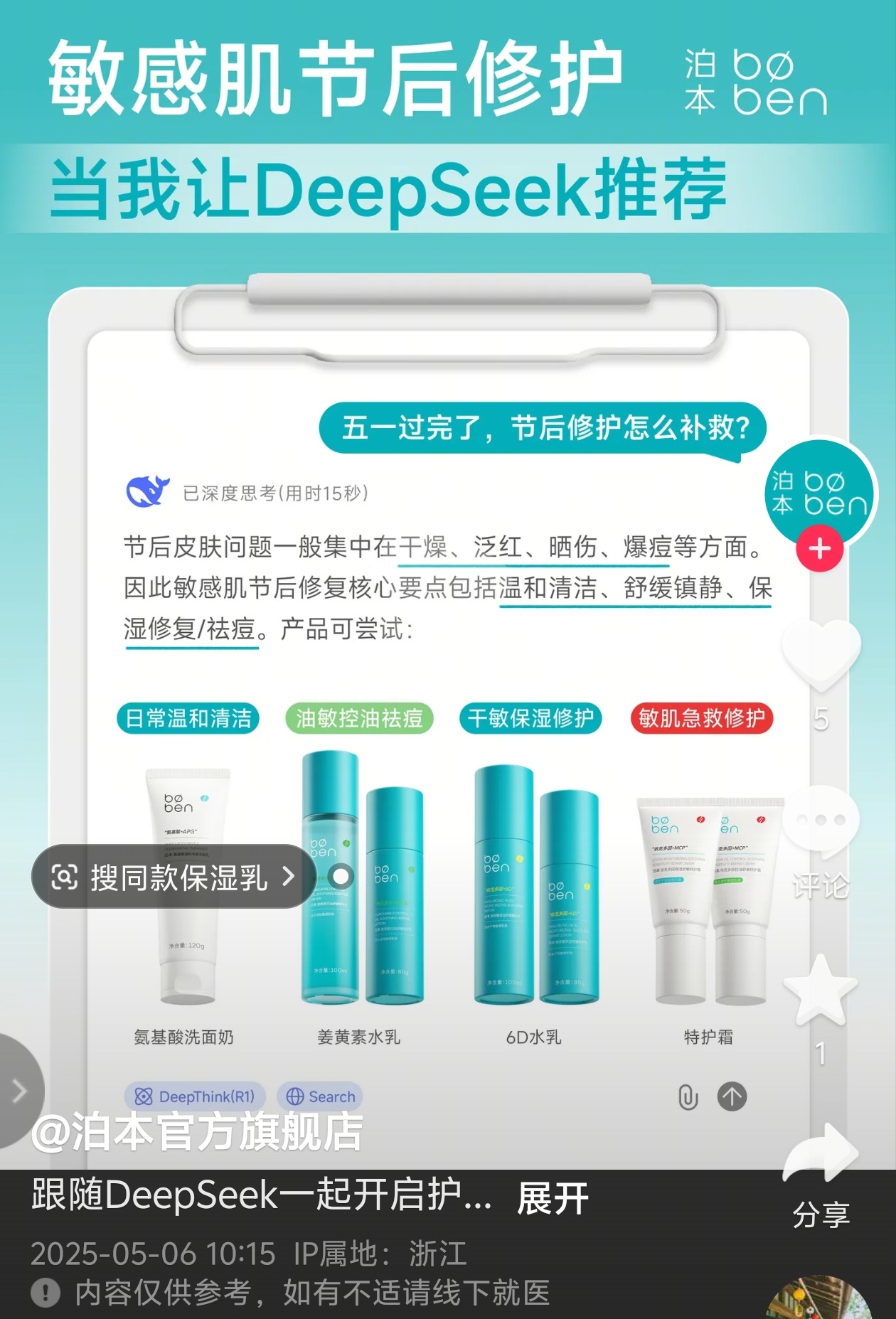 在这则推广中,泊本以“当我让DeepSeek举荐”为核心,称节后皮肤问题一般集中在干燥、泛红、晒伤、爆痘等方面。因此敏感肌节后修复核心要点包括温和清洁、舒缓镇静、保湿修复/祛痘,同时举荐尝试泊本自身的产品,诸如氨基酸洗面奶、姜黄素水乳、6D水乳、特护霜等。