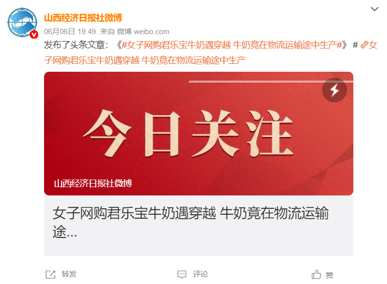 近日,君乐宝因产品悦鲜活生产日期问题陷入了质疑的风波。媒体称,贵州遵义闫女士于5月24日在拼多多君乐宝授权店购买悦鲜活牛奶,5月26日物流显示转运,27日运输中,31日收货。却发现瓶盖生产日期为5月27日、上市日期5月28日,且瓶身磨损严重。