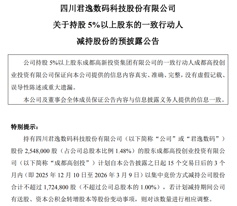 11月18日,君逸数码(301172.SZ)发布公告,公司股东成都高投创业投资有限公司(简称“成都高创投”)计划自2025年12月10日至2026年3月9日以集中竞价方式减持公司股份合计不超过172.48万股(不超过公司总股本的1.00%)。