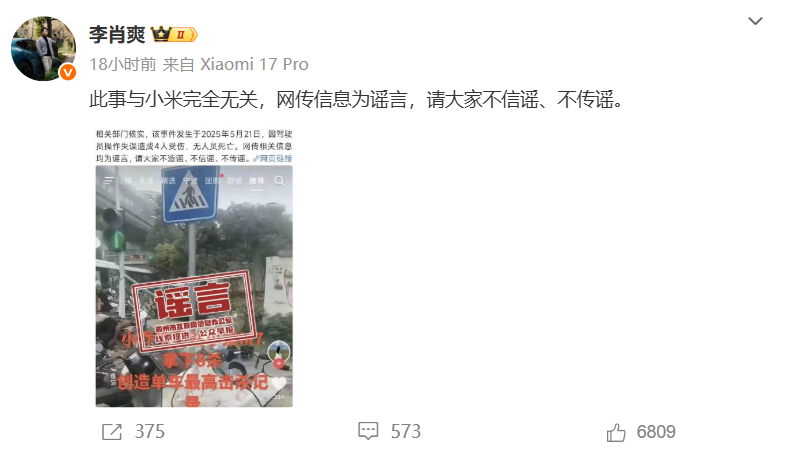 首页 > 出行 小米汽车李肖爽辟谣“小米M7车祸致8人死亡”:属谣言,与小米无关 发布时间: 2025-11-24 10:38:38 阅 71 11月23日,小米汽车副总裁李肖爽通过微博辟谣“小米M7车祸致8人死亡”称,此事与小米完全无关,网传信息为谣言。23日稍早时候,郑州市互联网信息办公室官方微博发布消息称,近日,网络平台账号“繁花如梦”发布信息称“小乔地铁站小米M7拿下8杀,创造单车最高击杀纪录”。经新郑市相关部门核实,该事件发生于2025年5月21日,因驾驶员操作失误造成4人受伤,无人员死亡。