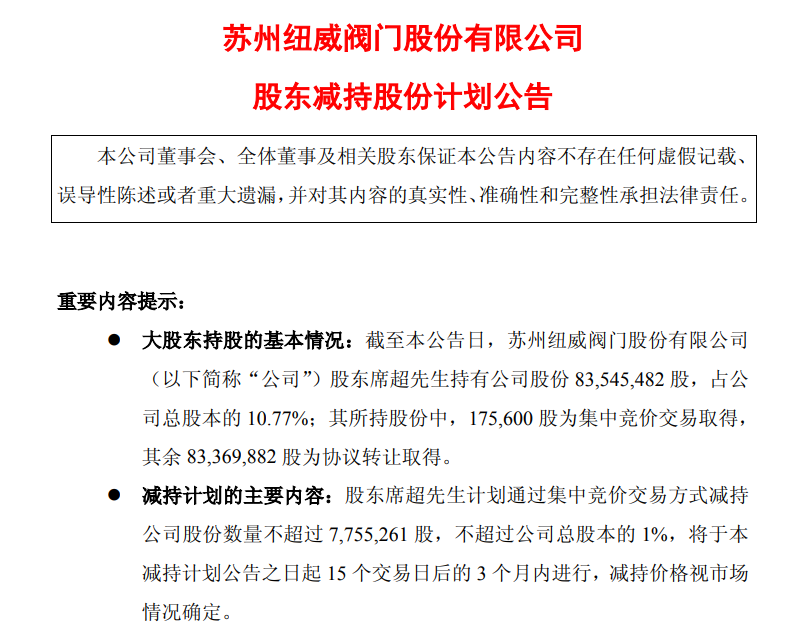 首页 > 产业 纽威股份:股东席超拟减持不超1%股份,不超过775.53万股 发布时间: 2025-12-01 23:13:03 阅 53 12月1日,纽威股份(603699.SH)发布公告,股东席超计划通过集中竞价交易方式减持公司股份数量不超过775.53万股,不超过公司总股本的1%,将于减持计划公告之日起15个交易日后的3个月内进行,减持价格视市场情况确定。公告称,本次减持计划的实施存在不确定性,席超先生将根据市场情况、公司股价情况等情形择机决定是否实施及如何实施本次股份减持计划,减持的数量和价格存在不确定性。本次股份减持计划系股东的正常减持行为,不会对公司治理结构及未来持续经营产生重大影响。