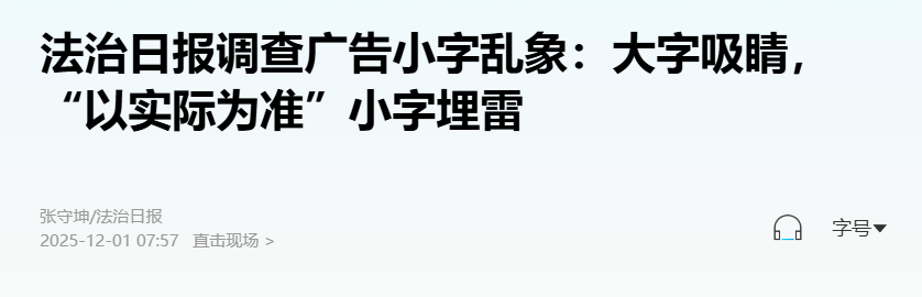“大字宣传,小字免责”现象指的是企业在商业广告宣传中,以醒目的大字标语或画面突出诱人信息,却在画面角落、页面底端、滚动条或折叠条款中,以近乎不可见的微小字体、复杂冗长的表述,设置一系列限制条件、附加费用或免责声明。这些“小字”内容往往涉及消费的关键约束,实质上架空了主广告语带来的美好预期。