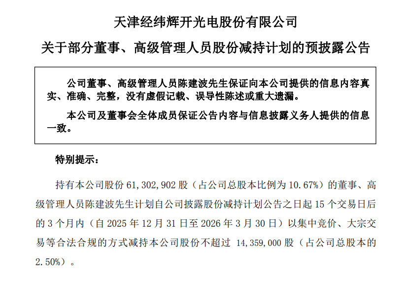 12月9日,经纬辉开(300120.SZ)公告,公司董事、高级管理人员陈建波先生计划自2025年12月31日至2026年3月30日以集中竞价、大宗交易等合法合规的方式减持公司股份不超过1435.9万股(占公司总股本的2.50%)。