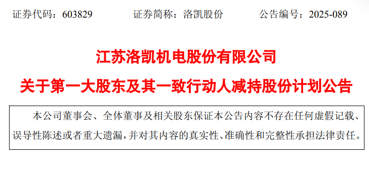 12月11日,洛凯股份(603829.SH)发布公告,出于自身资金需求,洛辉投资、洛腾投资、洛盛投资计划自本公告发布之日起十五个交易日后的三个月内,通过集中竞价交易方式合计减持公司股份不超过1,862,661股,即不超过公司总股本的1%,通过大宗交易方式合计减持公司股份不超过3,725,322股,即不超过公司总股本的2%。