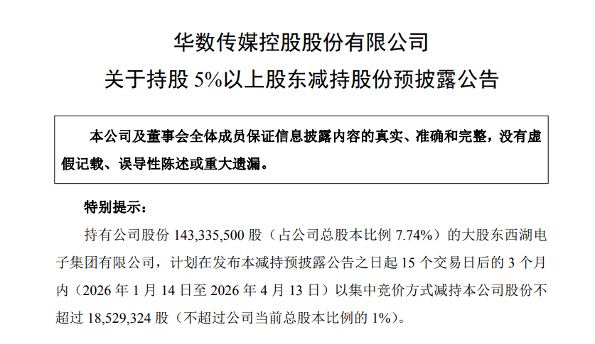 12月19日,华数传媒(000156.SZ)发布公告,公司大股东西湖电子集团有限公司,计划在2026年1月14日至2026年4月13日以集中竞价方式减持公司股份不超过1852.93万股(不超过公司当前总股本比例的1%)。