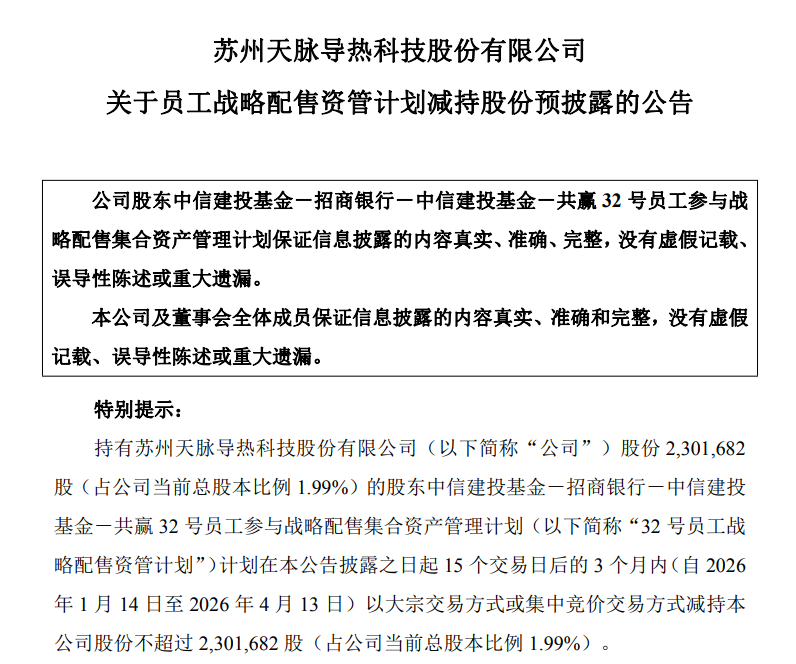 12月20日,苏州天脉(301626.SZ)公告,公司股东中信建投基金-招商银行-中信建投基金-共赢32号员工参与战略配售集合资产管理计划(简称“32号员工战略配售资管计划”)计划自2026年1月14日至2026年4月13日以大宗交易方式或集中竞价交易方式减持公司股份不超过230.1682万股(占公司当前总股本比例1.99%)。