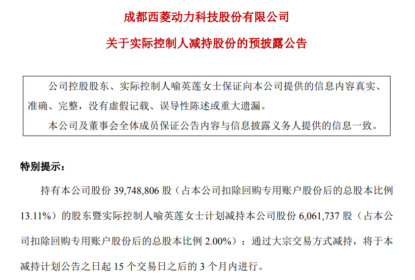 首页 > 产业 西菱动力:实际控制人喻英莲拟减持不超2%股份,不会导致公司控制权发生变更 发布时间: 2025-12-25 21:11:36 阅 49 12月25日,西菱动力(300733.SZ)发布公告,股东暨实际控制人喻英莲女士计划减持公司股份606.17万股(占公司扣除回购专用账户股份后的总股本比例2.00%):通过大宗交易方式减持,将于本减持计划公告之日起15个交易日之后的3个月内进行。公告称,喻英莲女士将根据二级市场价格进行减持,公司将按规定对喻英莲女士减持计划的实施进展情况进行披露。本次喻英莲女士减持股份不会导致公司控制权发生变更。