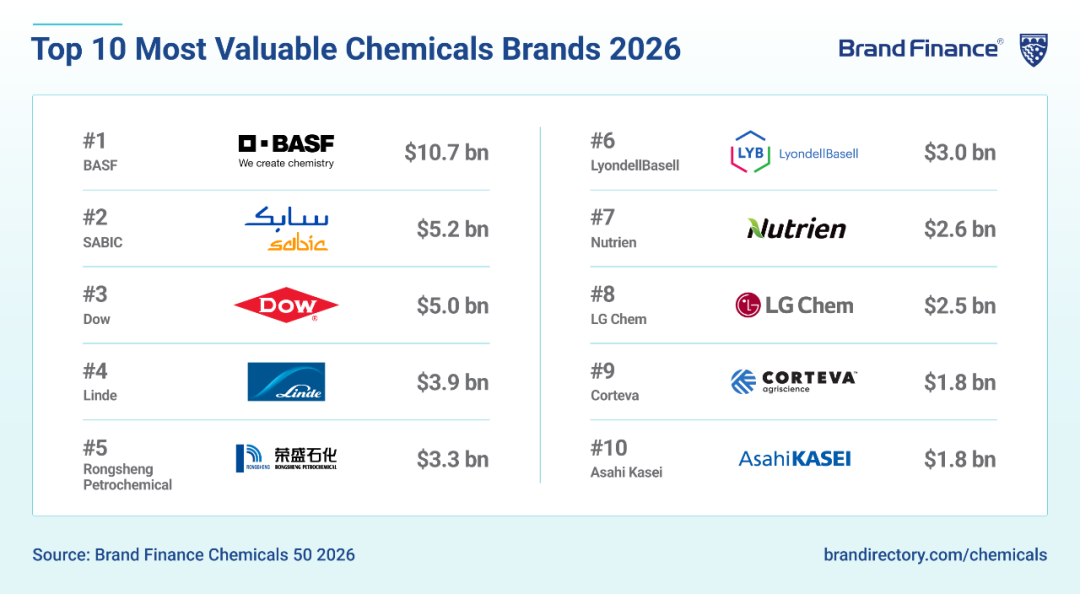 4月8日,国际权威品牌价值评估机构 Brand Finance 发布《2026 年全球化工最具价值品牌榜》,巴斯夫、沙特基础工业公司、美国陶氏、林德集团、荣盛石化依次上榜。荣盛石化凭借强劲的品牌韧性与全球影响力,成功蝉联全球第五位,品牌价值同比增长2.3%至33亿美元,是榜单前五名中唯一的中国品牌。
