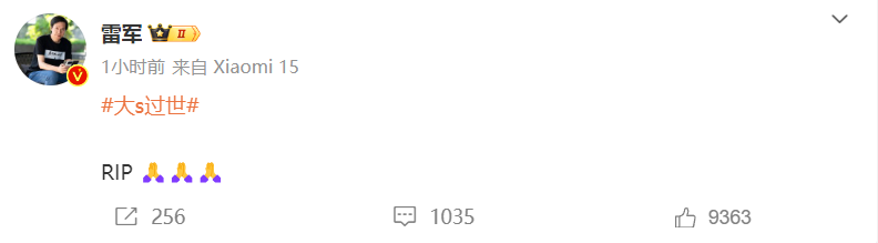 首页 > TMT 大S春节去世,雷军、刘若英、朱孝天等发文悼念 发布时间: 2025-02-03 12:25:03 阅 284 2月3日,小S家属发文:“谢谢大家的关心!新年期间,我们全家来日本旅游,我最亲爱善良的姐姐熙媛,因得了流感并发肺炎,不幸地离开了我们。”看到大S离世的消息后,众人纷纷发文悼念。雷军、歌手刘若英缅怀大S,曾一起拍摄《流星花园》的朱孝天更是直呼“晴天霹雳”。公开资料显示,徐熙媛别名大S,1976年10月6日出生于中国台湾省台北市,毕业于华冈艺校戏剧科,中国台湾女演员、歌手、主持人、作家。
